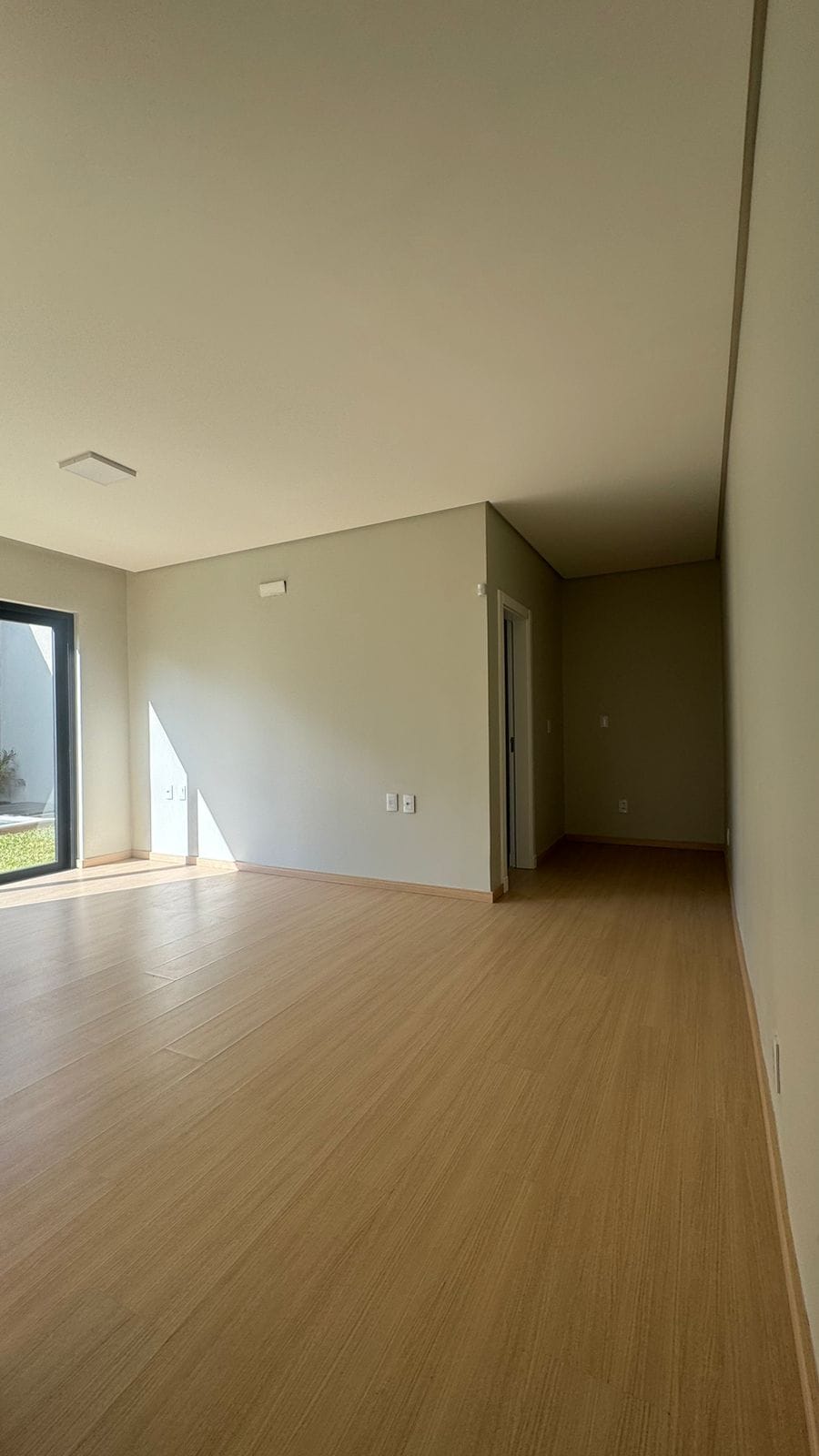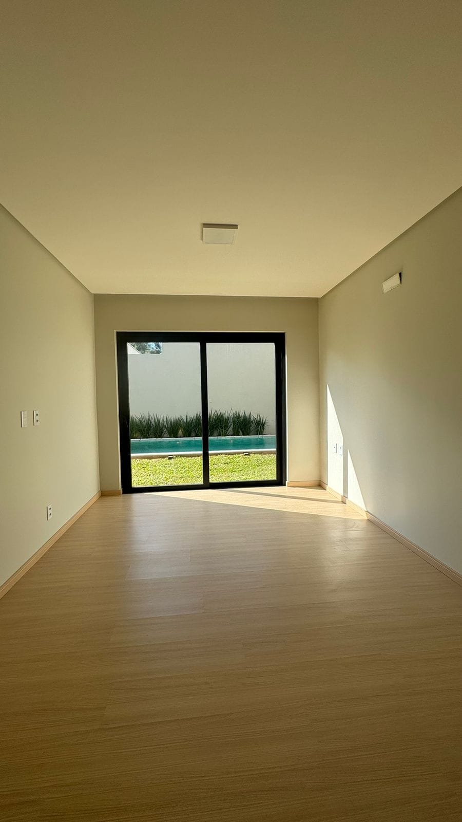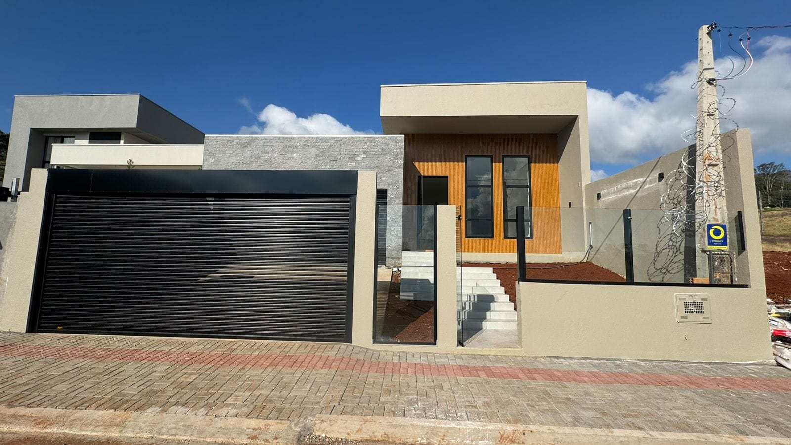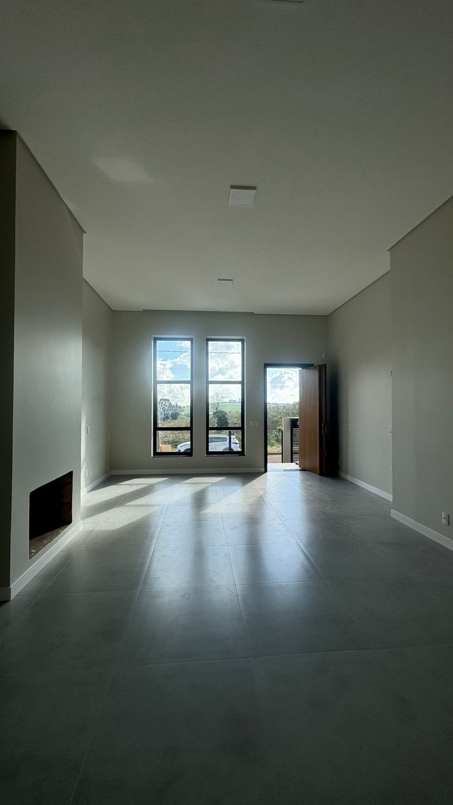 Casa em alvenaria em 1 pavimento com 202m² de área construída, 3 suítes, sala living com pé direito duplo, lareira e adega, cozinha, lavanderia, lavabo, varanda coberta, piscina em alvenaria, jardim, duas vagas individuais de garagem, infraestrutura para aquecimento solar, infraestrutura para automação e segurança, aspiração central com pontos na suíte máster, circulação e sala de estar.